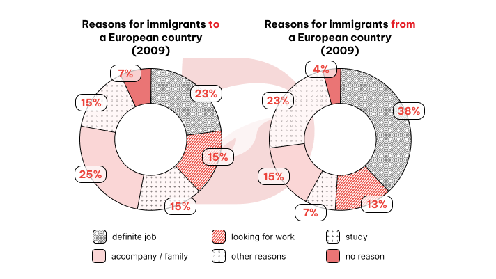 The given pie charts provide information on the percentage of people immigrating to and from a European country in 2009, categorized by different purposes.