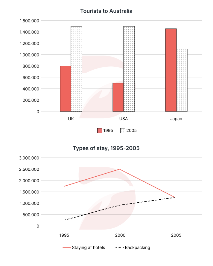 Đề thi IELTS Writing Task 1 ngày 18/01/2025 dạng Mixed charts: The bar chart below shows how tourism to Australia from three different countries changed between 1995 and 2005. The line chart illustrates the types of stay that tourists chose during the same period.