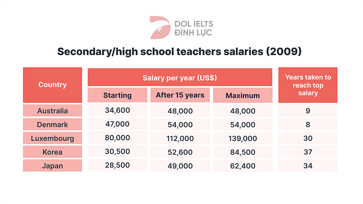 Sau sample The table below gives information about salaries of secondary/high school teachers in five countries in 2009, DOL sẽ giúp bạn hệ thống lại những cấu trúc nổi bật và những điểm từ vựng, ngữ pháp band 8 nhé!